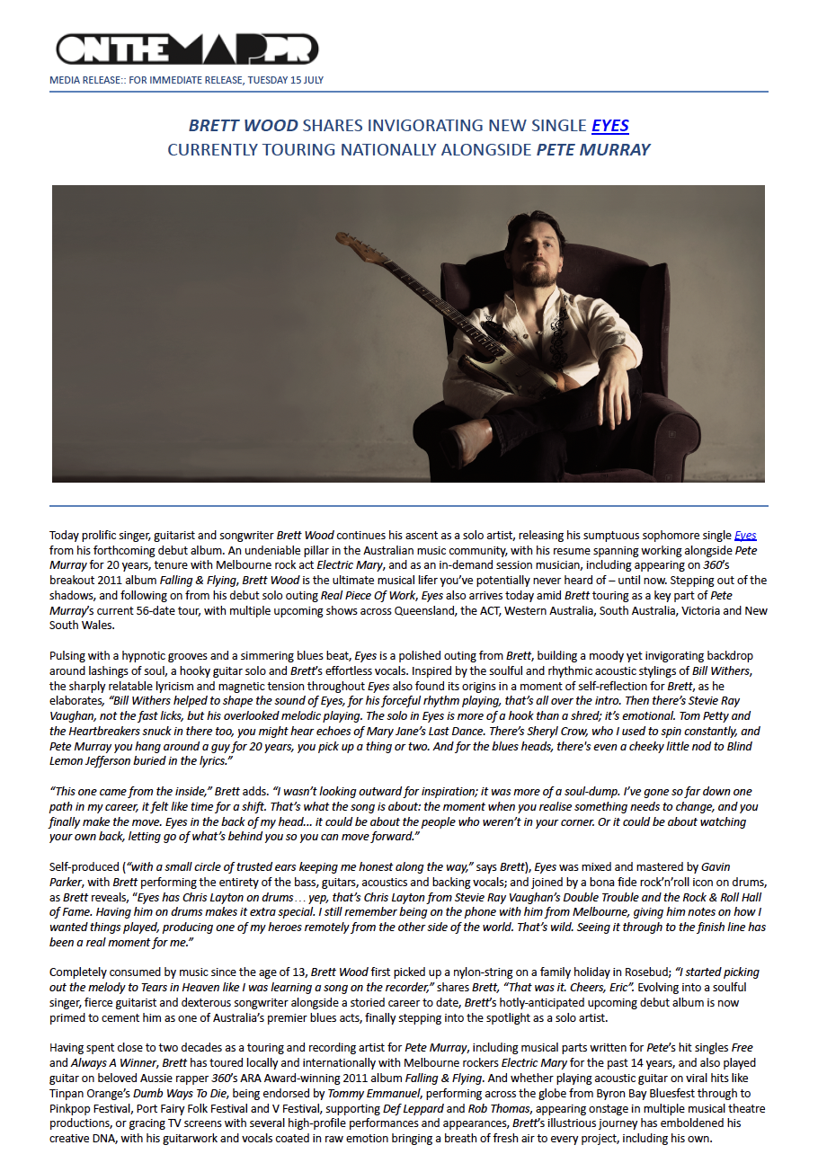 “Brett Wood’s ‘Real Piece of Work’ opens with a confident blues rock jam that hooks the crowd instantly. From the Stevie Ray Vaughan-tinged ‘Finders Keepers’ to his soulful new single ‘Eyes’, his polished yet gritty songs feel earthy and from the heart. Blending melodic rock, blues and soul, he’s worth arriving early to see.”